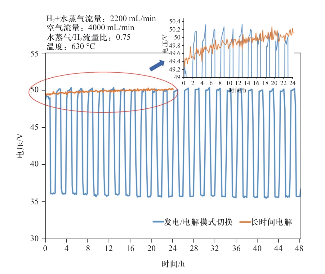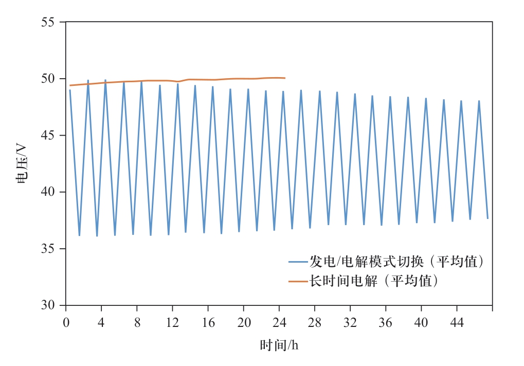电堆长时间运行测试结果如图13所示,对比了单一电解工况与发电、电解模式切换时电堆电压的变化趋势,对应工作模式切换时间为1 h,充放电电流均为0.5 A。由局部放大图可以看出,相同电解时间下(24 h),单一电解工况电压呈现明显的上升趋势,而工作于模式切换下电堆的电压整体呈现稳态,并未出现显著的衰减。