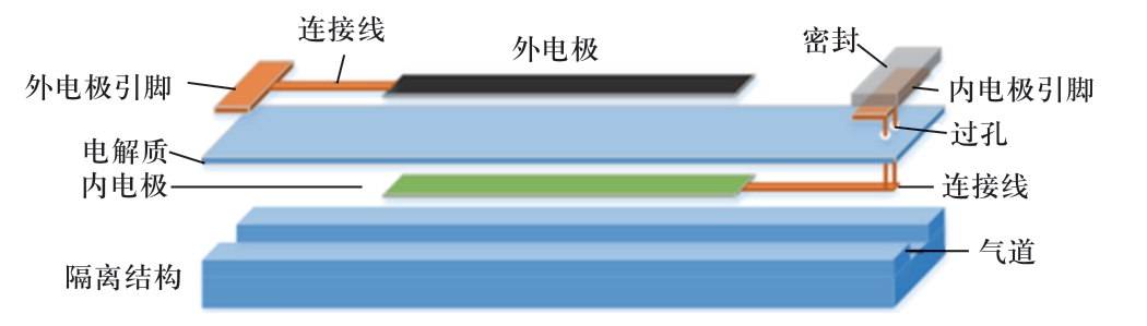 电池基本结构如图1所示[23],整体采用层状结构,电极、电解质、气道、隔离结构等电池部件依次叠加,电解质和整个隔离结构由一种材料组成并经由一次叠压和烧结成型,有效保证了电池批量生产工艺的稳定性和电池高温作业的良好抗热震性,减小温度参量对调频应用的约束。