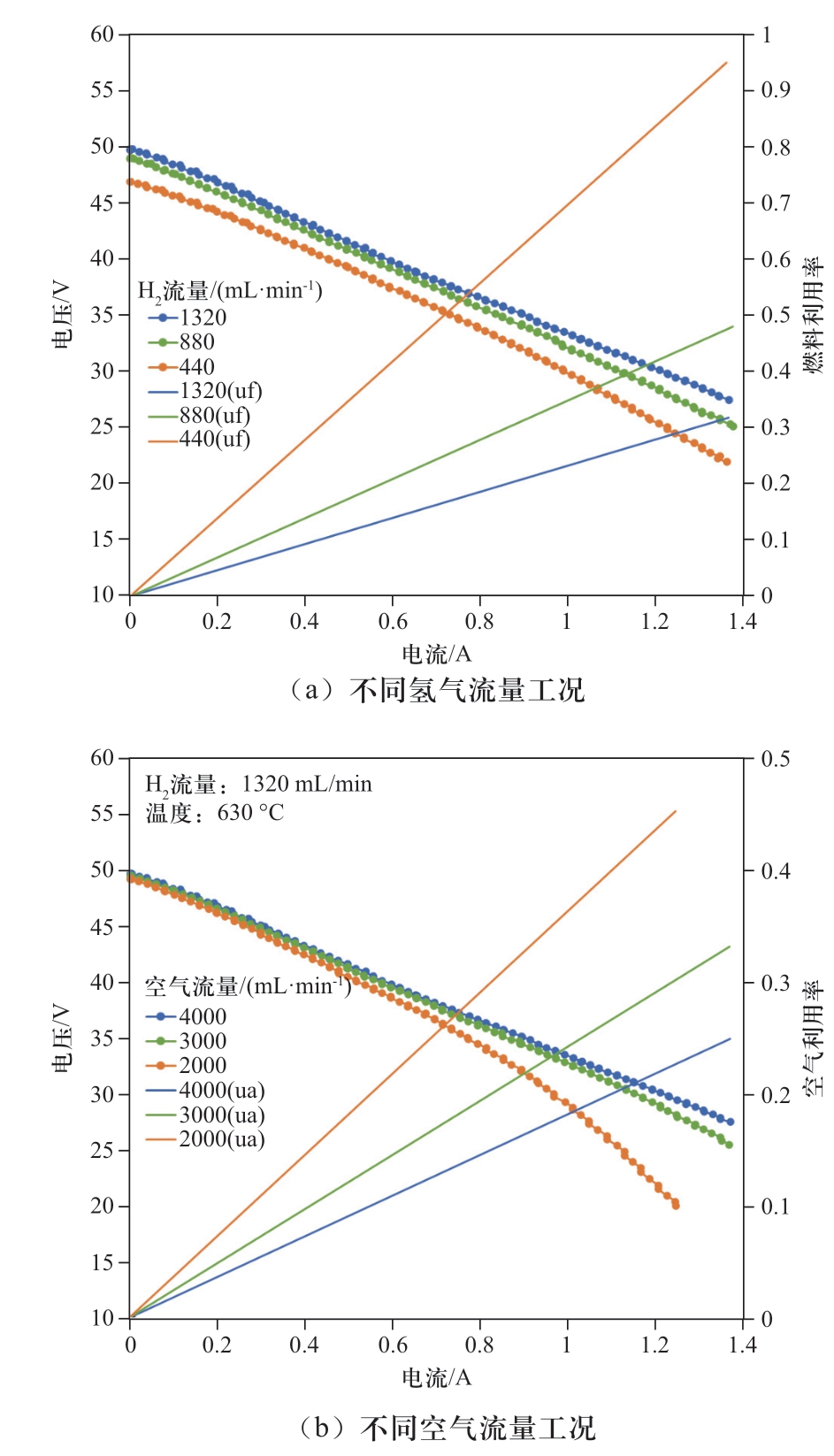 图5 (a)为不同氢气流量下,电堆的I-V扫描曲线对比。由图可以看出,随着入口氢气流量的减小,电堆的开路电压呈现显著下降趋势,440 mL/min与1320 mL/min氢气流量工况下对应的开路电压差达到了2.89 V。这主要是由于氢气流量的减小,会导致电池三相界面处氢分压降低,电堆的能斯特电动势随之下降。随着电流的增加,不同氢气流量下电堆的电压差基本保持不变,整体I-V曲线线性度良好,燃料利用率[14]达到90%以上,仍未出现传质极限点,体现了新型电堆在燃料传质方面的优越性。故在调频应用时,氢气流量能够线性影响电堆自身的可调容量、调节深度等指标,可优选作为有效的控制变量,在考虑调频容量、里程的基础上,尽可能提高燃料利用率,优化电堆的发电效率。