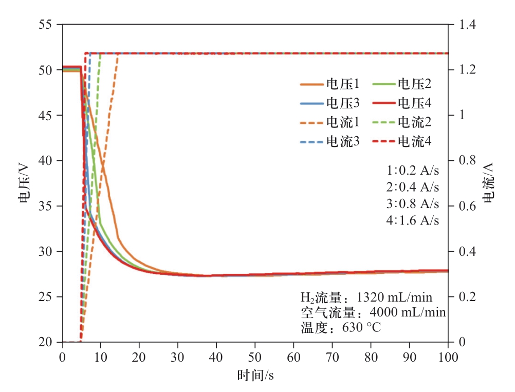 另一方面,可以看到在大电流下,新型电堆的传质/传热响应时间尺度在min级别,远高于单电池测试的传质/传热响应时间(约2 s,如图9所示,数据来源于浙江臻泰能源有限公司单电池实验测试),这主要是由电堆热容以及传质空间尺度的增大引起。因此,电堆层级的调频应用中,传质过程也将成为调节速率的约束条件,避免动态运行过程中产生局部饥饿现象至关重要。
