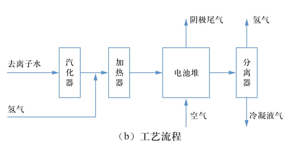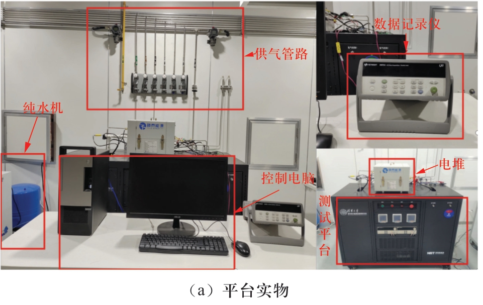 测试平台实物及工艺流程如图4所示,主要由流量控制计、柱塞泵、汽化器、加热器、热交换器、分离器、电子负载、电源等硬件设备组成,可以为电堆测试提供所需的水蒸气、氢气、空气等原料,并构建相应的工作温度区间。同时,为满足动态试验的数据采集频率,额外配置了电流传感器与安捷伦数据记录仪,用于采集动态试验数据。试验时,测试平台可通过电磁阀切换载气管道,满足电堆测试过程中不同工作模式所需的气体组分。