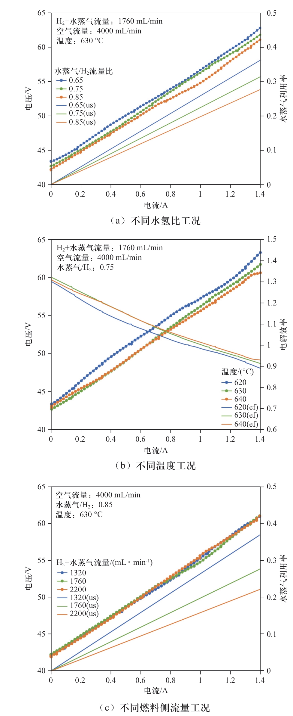 该模式下,设置电堆处于不同工作温度(620 ℃、630 ℃、640 ℃)、燃料侧流量(H2+水蒸气,1320 mL/min、1760 mL/min、2200 mL/min)、水氢比(水蒸气/H2,0.65、0.75、0.85)工况下,进行I-V扫描,对应结果如图6所示。