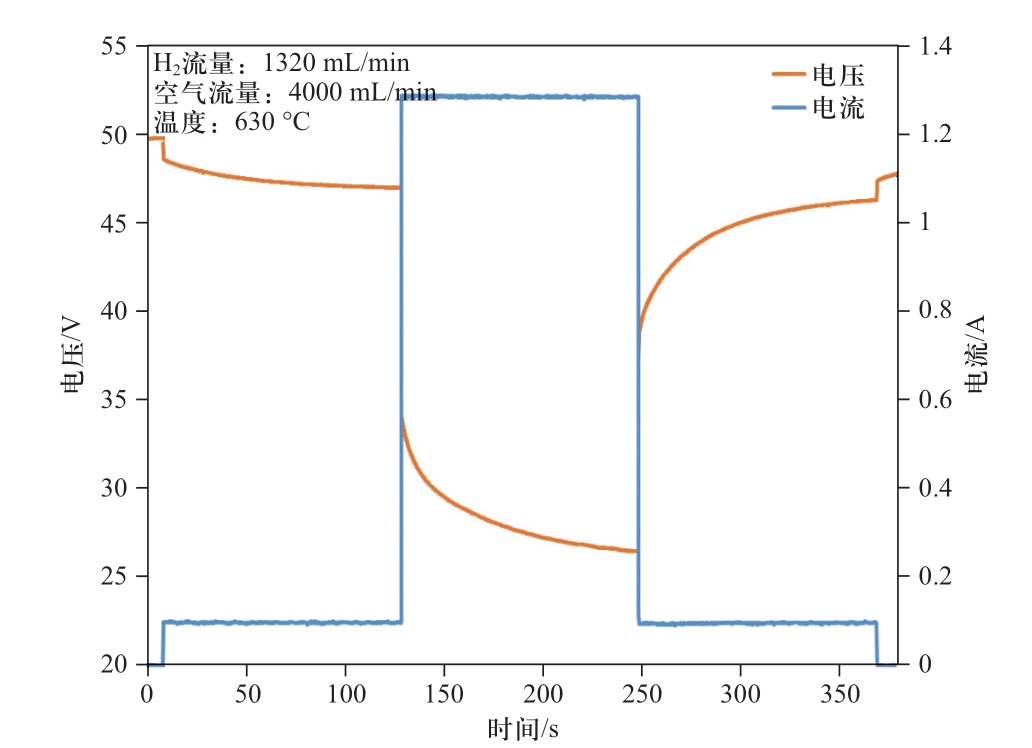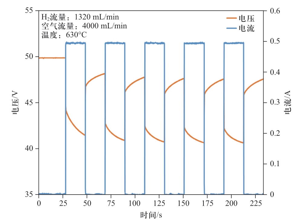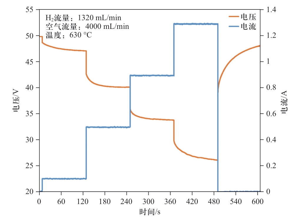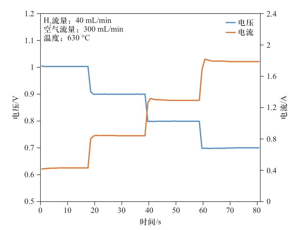 发电模式下,电堆的阶跃电流变化动态响应如图8所示,电流从0.1 A变化至1.3 A,每次变化幅值为0.4 A,每组电流持续时间为2 min,电流变化过程中,控制相关流量、温度保持不变。