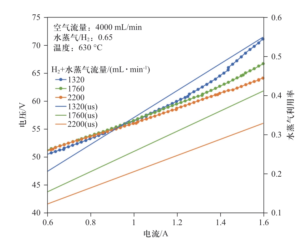 较大水氢比 (0.85)下,不同燃料侧流量对电堆电解电压的影响几乎为0 (如图6 (c)所示),推测可能由于测试过程中燃料侧的水蒸气利用率整体较低[28],电解产氢量较少,对电池通道的氢/水分压带来的影响较小,同时外部水蒸气供应不稳定,导致气体分压难以呈现规律性变化。进一步比较水氢比在0.65时不同燃料侧流量的I-V响应曲线,如图7所示,当电流增加至1.2 A以上时,1320 mL/min流量工况下的电压出现显著的传质极限点,流量的增加能够有效减少浓差极化损失。