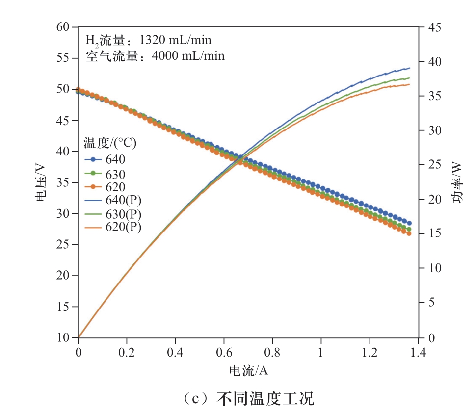 温度对电堆工作性能的影响如图5 (c)所示,可以看出,低电流工况下(<0.4 A),温度变化对电堆功率输出性能影响较小,放电电流达到0.4 A以上时,随着电流的增大,不同温度工况下电堆的电压差逐渐增大,1.3 A时达到约1.5 V(640 ℃与620 ℃工况之间)。故而在调频应用下,温度可根据电堆当前的调节深度,选择性地作为调节变量。