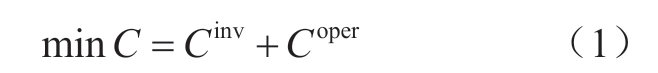 式 (1) 表示新能源基地电-氢-碳协同开发模型以全系统总成本最低为目标。为便于分析,式中所有成本费用均折算为研究水平年的现值,C表示电-氢-碳协同开发系统的年化费用,Cinv为系统投资总费用,Coper为年运行费用。其中:
