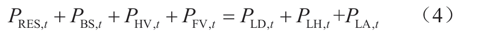 式 (4) 模拟了考虑新能源基地电源机组组合和出力状态的实时电力平衡。式中:P表示新能源基地所有电源出力及用电负荷,下标RES、BS、HV、FV分别表示新能源电源、储能、氢发电、燃煤发电,LD、LH、LA表示外送电力、制氢负荷以及合成氨/甲醇等后续氢能利用环节的用电负荷;t表示所在时刻。其中,PBS,t为正数代表放电,负数代表充电。