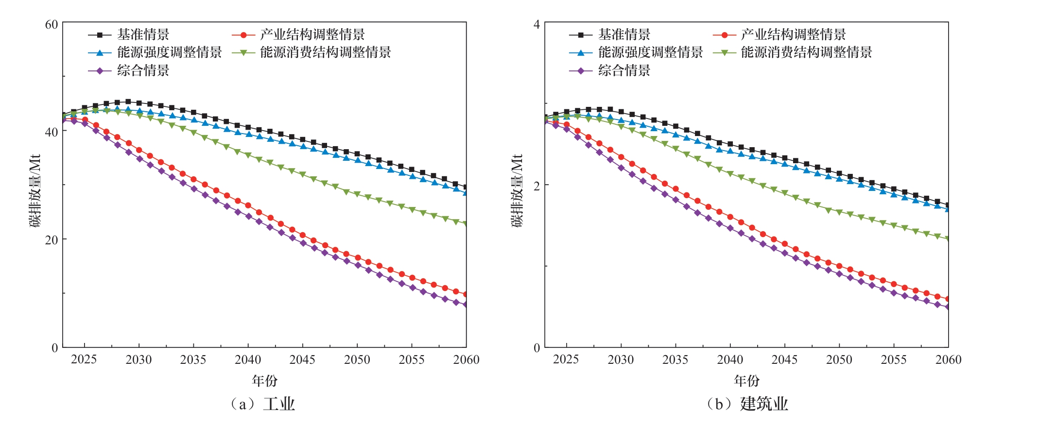 由图5所示,第二产业是贵州省碳排放的主要来源,但其减排潜力最大,在所有情景中,碳排放量均呈下降趋势。其中基准情景达峰时间预计在2029年,达峰量为48.2 Mt;产业结构调整情景2023年即可实现达峰,达峰量为45.0 Mt;综合情景也预计在2023年达峰,达峰量为44.8 Mt,在结构优化、技术升级与能源转型多路径协同作用下,综合场景碳排放量在达峰后快速下降,到2060年下降至8.4 Mt。如图6所示,工业是贵州省第二产业碳排放量的最主要来源,在各情景中占比均高达90%以上,其中综合情景对贵州省工业碳减排效果最佳,2023年即可达峰,达峰量为42.0 Mt,2060年下降至7.9 Mt。