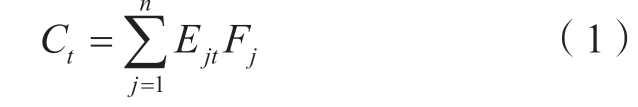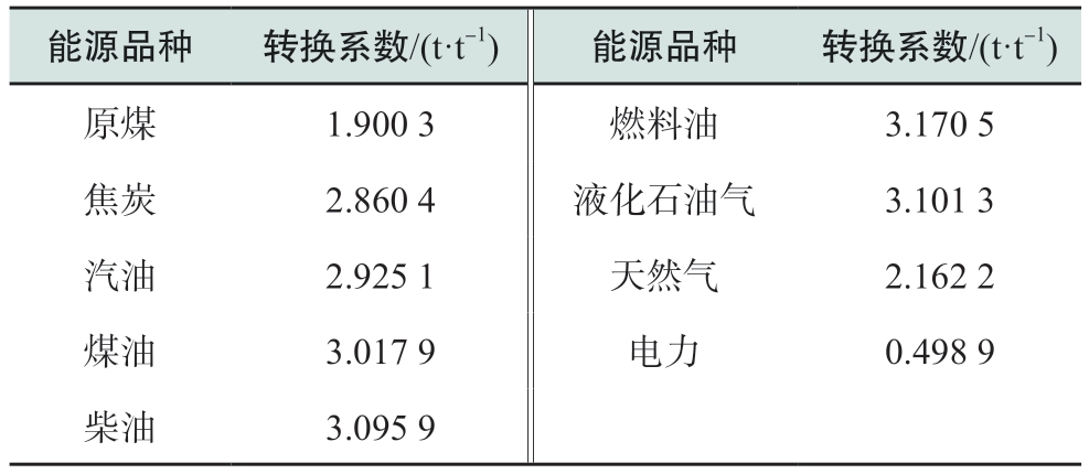 式中:C为终端能源碳排放总量;Ct为第t年碳排放总量,万t;E为终端能源消费总量;Ejt为第t年j类能源消费量(以标准煤计),万t;Fj为j类能源碳排放转换系数(标准煤/二氧化碳),t/t。主要能源品种碳排放转换系数如表1所示。电力产品调入调出所产生的二氧化碳属间接排放,当前,关于此类电力交易产生的碳排放应归属于生产者还是消费者的议题,尚未形成统一共识。鉴于这一归属争议的存在,本文不考虑电力调入与调出所导致的间接排放量,只计算直接产生的二氧化碳排放量。