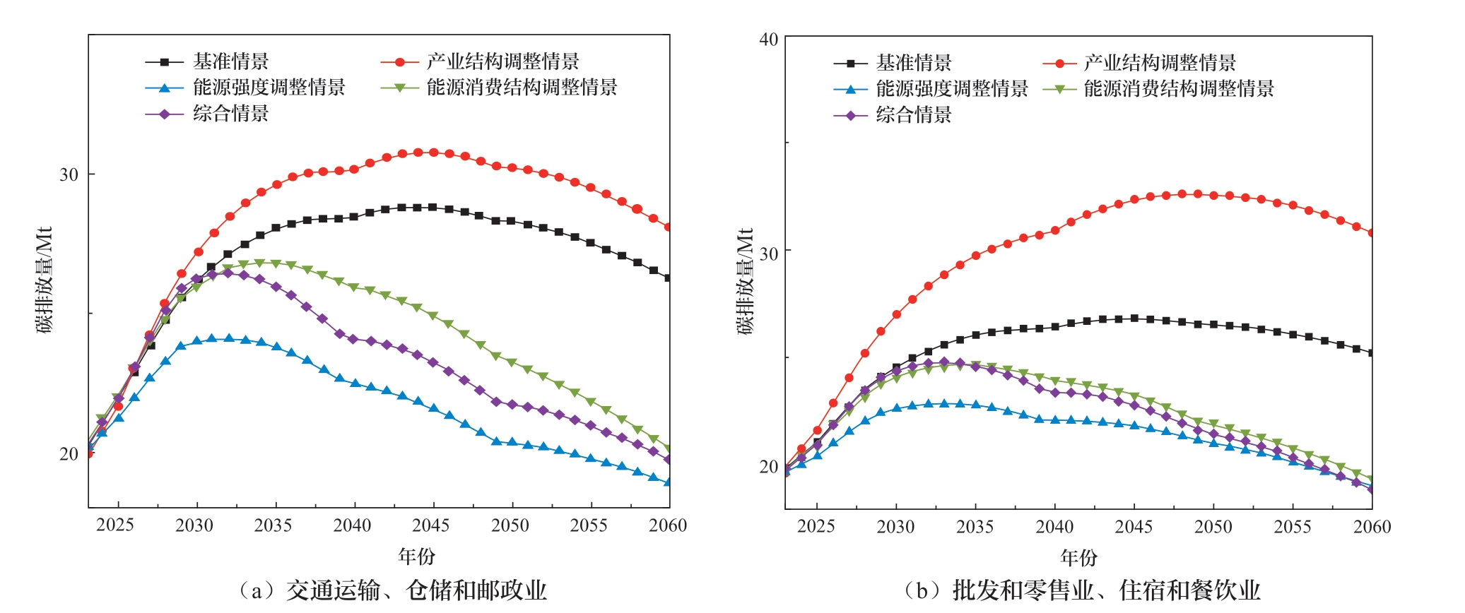 由图5可知,在各情景下,贵州省第三产业碳排放占比总体呈上升趋势,随着经济发展与产业结构逐步变迁,第三产业规模扩张,其碳排放总量也随之稳步增加。能源强度调整情景相比其他情景减排效果最优,预计在2034年达峰,达峰量为81.2 Mt。产业结构调整情景下,第三产业碳排放达峰时间最晚,于2047年达峰,达峰量为109.3 Mt。如图7所示,以交通运输、仓储和邮政业、批发和零售业、住宿和餐饮业为例,产业结构调整对上述行业碳排放的影响较为显著,碳排放量增长幅度较大,在后期明显高于其他情景。