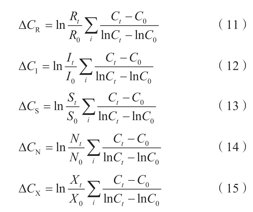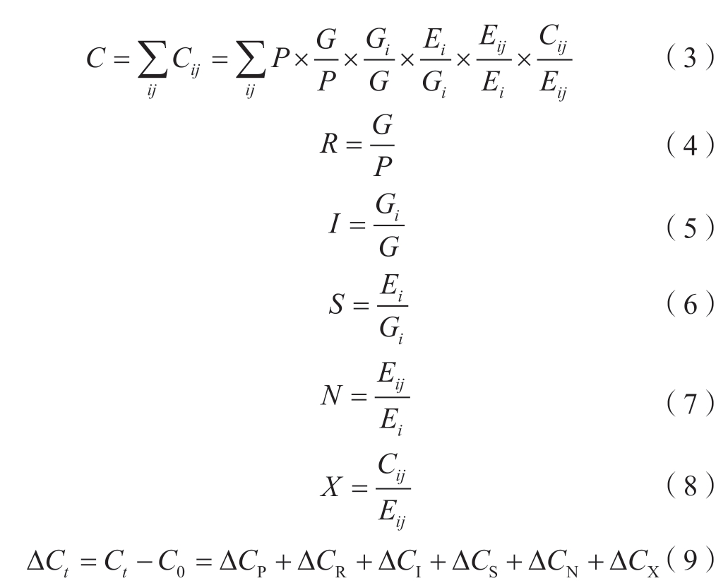 式中:Cij为第i个产业j类终端能源消费碳排放量,万t;P为常住人口数,万人,表示人口规模效应;Eij为第i个产业j类终端能源消费量(以标准煤计),万t;R为人均经济产值,表示经济产出效应;I为某产业产值占生产总值的比例,表示产业结构效应;S为单位产值终端能源消费量,表示能源强度效应;N为某类终端能源消费量占能源消费总量的比例,表示能源消费结构效应;X为终端碳排放量与终端能源消费量的比例,表示碳排放强度效应;∆C表示前后2期碳排放增量。