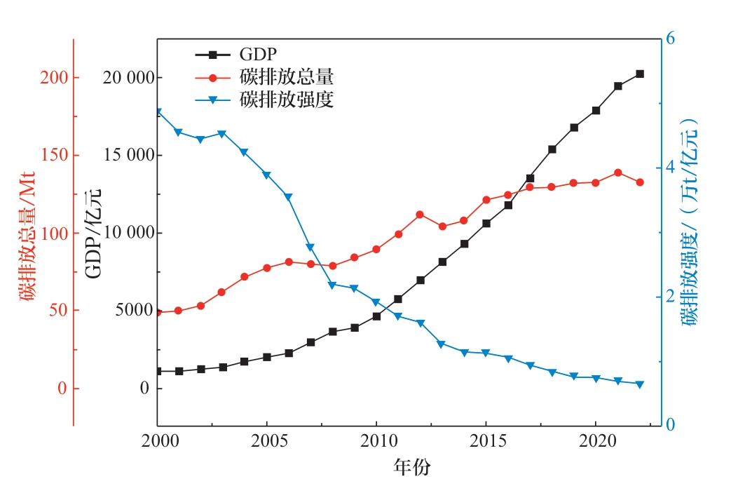图2 贵州省2000—2022年GDP、碳排放总量、碳排放强度
