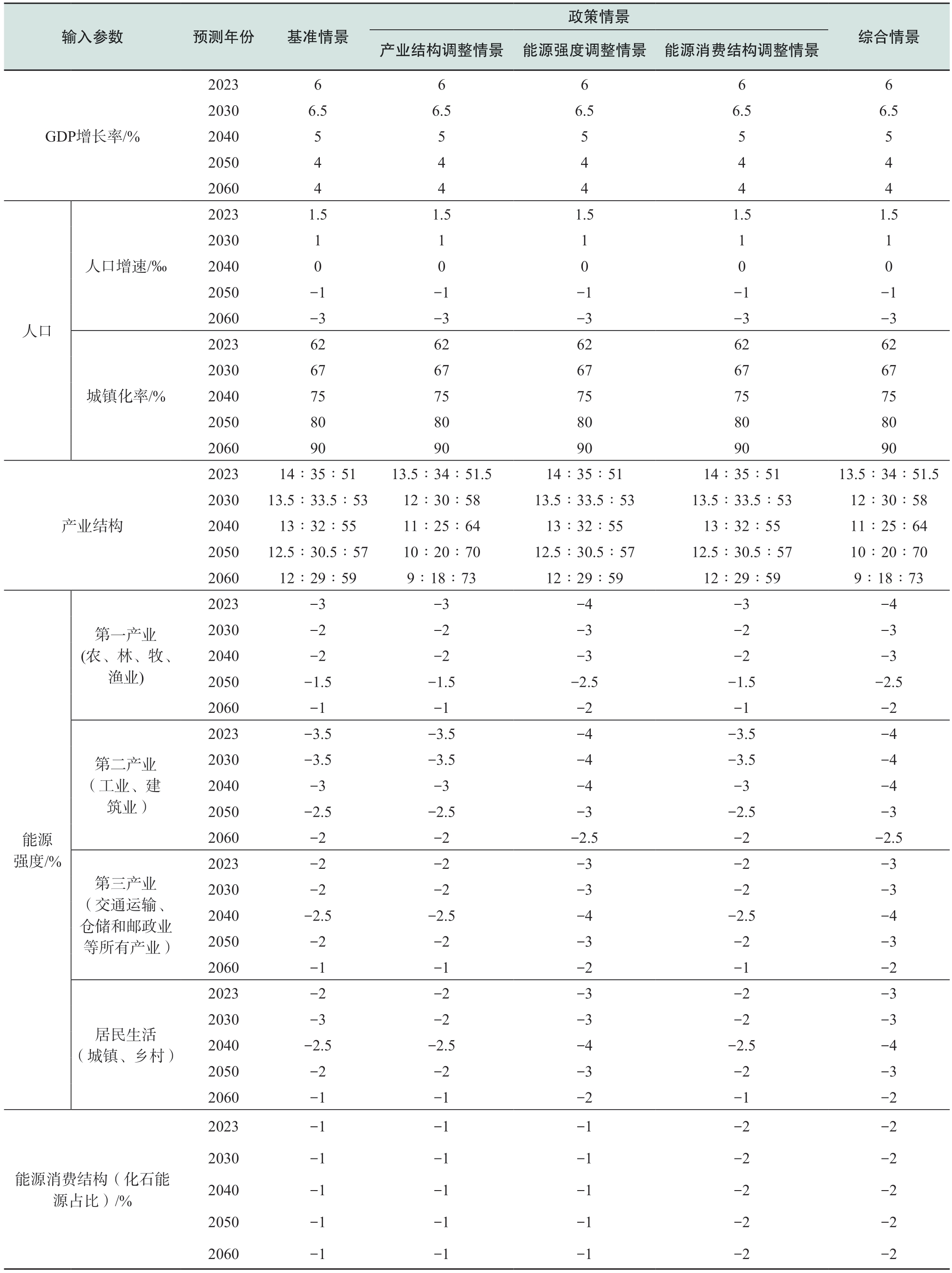 本研究以2022年为基准年,采用自下而上的建模方法,通过部门技术参数调控实现多维情景模拟,结合上述LMDI模型研究结论,选取经济因素、人口情况、产业结构、能源强度、能源消费结构作为关键参数,分为基准情景、政策情景、综合情景三大情景对2023—2060年贵州省终端能源碳排放量进行预测分析,具体参数设定值见表3。