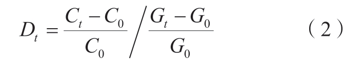 碳排放脱钩是经济增长与温室气体排放之间关系不断弱化乃至消失的理想化过程[34-35],即实现经济增长基础上,碳排量逐渐降低的发展状态。计算公式为