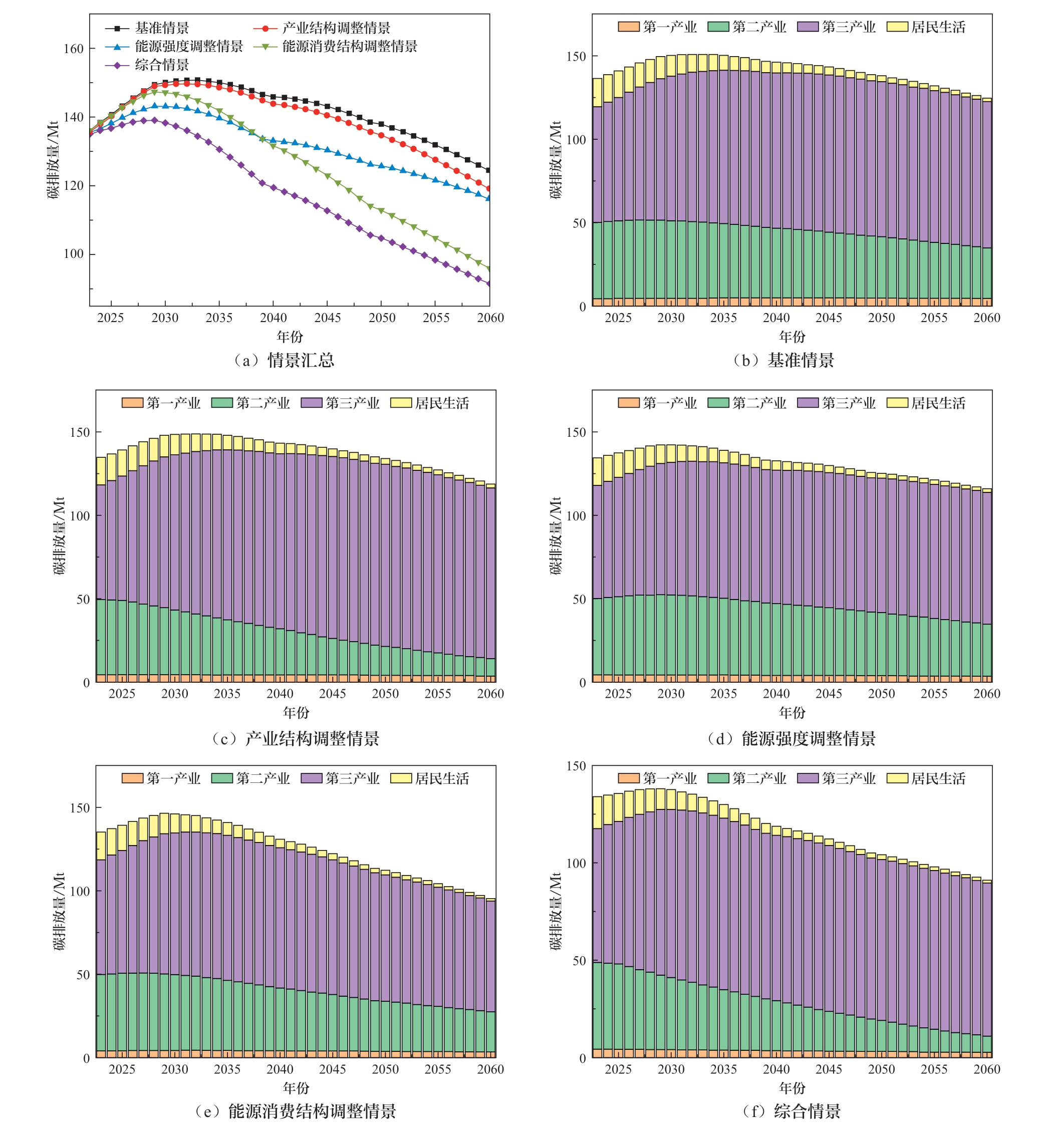 由预测结果图5 (a)可知,在不同发展情景设定下,贵州省碳排放峰值的出现时间存在差异,在能源强度调整情景、能源消费结构调整情景和综合情景3种情景下,贵州省碳排放预计在2029年达到峰值;在基准情景和产业结构调整情景下,贵州省碳排放预计在2032年达到峰值。基准情景下,碳排放峰值为150.8 Mt,达到峰值后,碳排量年均下降0.68%,至2060年碳排量将降到124.6 Mt。3个政策情景下,产业结构调整情景峰值为149.7 Mt,达峰后碳排量年均下降0.81%,至2060年碳排量将降到119.1 Mt;能源强度调整情景峰值为143.2 Mt,达峰后碳排量年均下降0.67%,至2060年碳排量将降到116.3 Mt;能源消费结构调整情景峰值为147.4 Mt,达峰后碳排量年均下降1.37%,至2060年碳排量将降到96.0 Mt。综合情景下,峰值为139.1 Mt,达峰后碳排放量年均下降1.34%,至2060年碳排量将降到91.6 Mt。