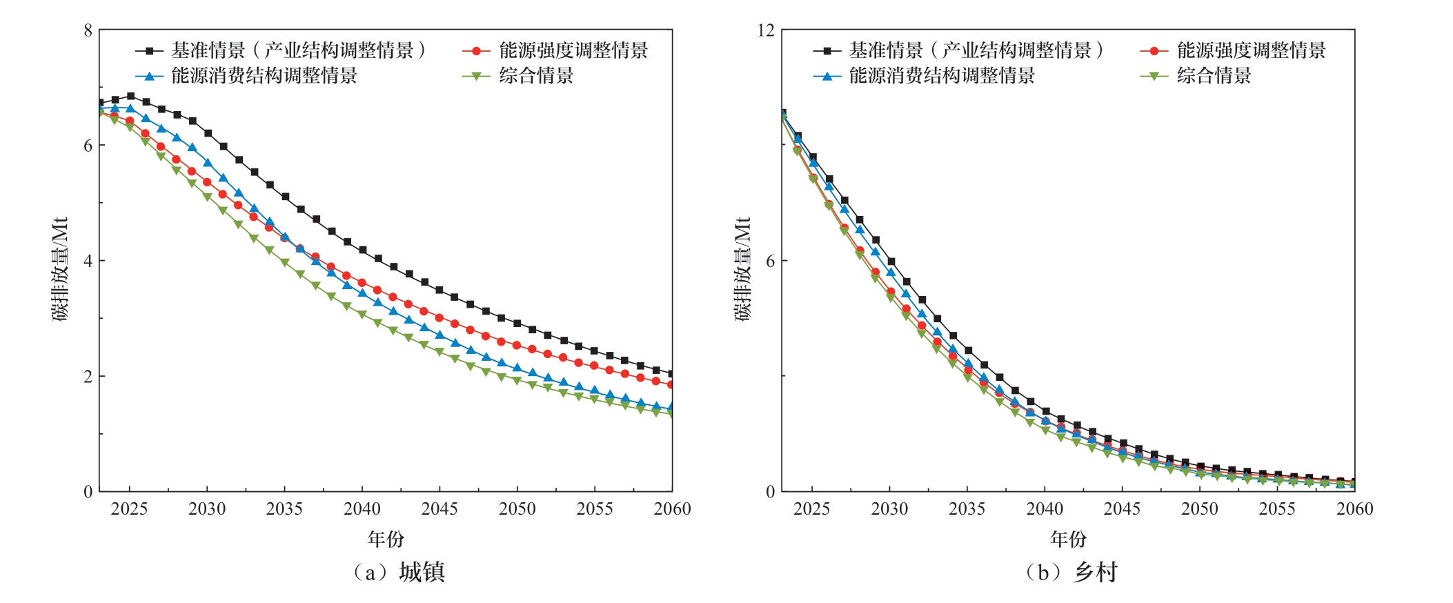 如图5所示,在各情景下,贵州省居民生活碳排放量总体呈下降趋势,均于2023年实现达峰。其中综合情景相比其他情景在居民生活中减排效果最优,2060年下降至1.5 Mt。由图8所示,城镇和乡村碳排放量均呈现下降趋势,其中农村碳排放量相比城镇碳排量下降速度较为迅速。综合情景对降低城镇碳排放量效果最为显著,至2060年下降至1.3 Mt。随着城镇化加速,人口、产业不断向城镇集聚,以及农村能源结构持续优化,在各个情景下农村碳排放量将持续下降,到2060年趋近于零。